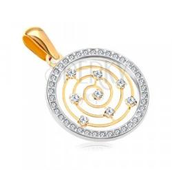 A 14K kombinált arany medált karika alkotja fehér arany réteggel és beültetett átlátszó cirkóniákkal díszítve. Középen egy keskeny spirális található sárga aranyból, amelyet nyolc nagyobb átlátszó cirkónia egészít ki. A láncra kerülő szem hosszúkás, felfelé enyhén szélesedik. Medál átmérője: 17 mmMedál súlya: 0,6 gLáncra kerülő szem szélessége: 2 mmFém