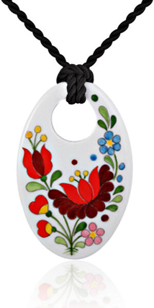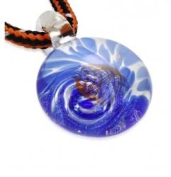 Nyaklánc fém zárszerkezettel, díszes medállal. A medál üvegből készült, amelyet kék és narancssárga absztrakt ívek díszítik. A zsinóros rész három színű fonatból készült. A láncra kerülő szem a medál része. A lánc hossza állítható, delfinkapcsos a zárszerkezete. Medál mérete: 20 x 27 mmZsinór szélessége: 3 mmZsinór hossza: 470 mmHosszabbítható rész: 30 mm
