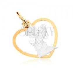 Kétszínű medál 9K aranyból, fényes körvonalból szív alakban sárga aranyból és egy imátkozó angyallal fehér aranyból, amely a szív közepébe van helyezve. A medál felülete ródiummal kezelt. A láncra kerülő szem ovális alakú. A medál méretei: 14 x 14 mmA medál súlya: 0,2 gA láncra kerülő szem szélessége: 2 mmFémjelzéssel ellátott. Medál lánc nélkül. A ródiu