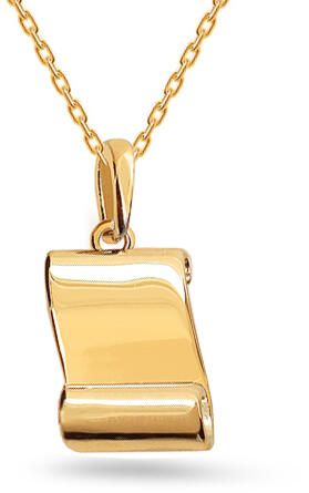 Elegáns medál sárga 14 karátos aranyból. A medál felcsavart pergamen alakú, ahol a medál felülete fényes. Alkalmas kezdőbetűk, nevek, dátumok stb. gravírozására. Ajándékba ajánljuk.