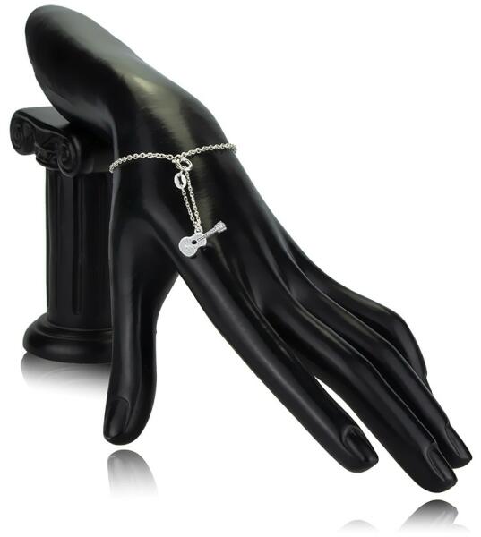 A 925 ezüstből készült medál függőlegesen összekapcsolódó ovális láncszemekből álló láncból áll. A díszítő részen egy gitár látható, amelyben átlátszó kerek cirkóniák vannak elhelyezve. A karkötőre vagy láncra való medál rugós gyűrűzárral rögzíthető. A medál mérete: 7 x 17 mmLánc hossza: 50 mmA medál súlya: 1,2 gRugós gyűrűzár átmérője: 3 mmFé