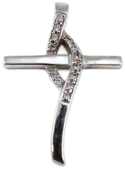 Modern stílusú, íves kialakítású, cirkónia kövekkel díszített, fényes ródiumozott felületű, fehérarany kereszt medál.