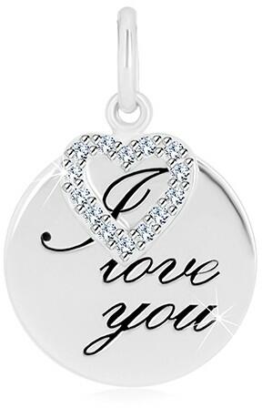 A 925 ezüst medál kör alakú. A lapos kör elején a díszes "I love you" - "Szeretlek" felirat olvasható. A felirat sekély és keskeny vonalait fekete fénymáz emeli ki. A kört egy szimmetrikus szív körvonal egészíti ki. A szív körvonal egyik oldala átlátszó kerek cirkóniákkal van kirakva. A medál felülete fényes. A láncra kerülő szem ovális. A kör átmérője: 16 mmA sz