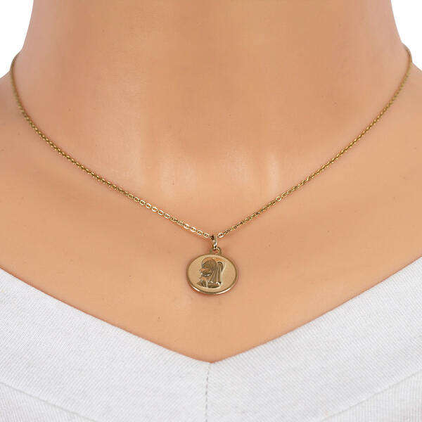Medál 9K sárga aranyból, lapos kör alakban fényes Szűz Mária képpel díszítve matt háttéren. A medál fényes vonallal van keretezve. A láncra kerülő szem ovális. A medál méretei: 14 x 16 mmA medál súlya: 0,6 gA láncra kerülő szem szélessége: 2,5 mmFémjelzéssel ellátott. Medál lánc nélkül.