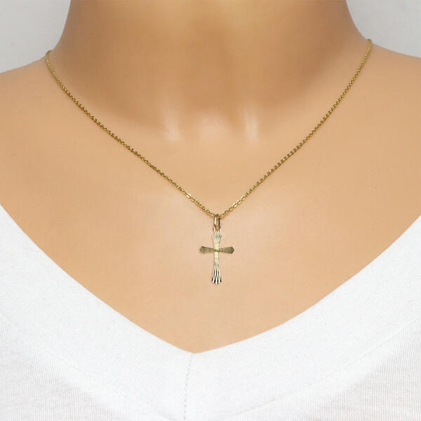 Medál 14K aranyból lapos kereszt alakban. A felszíne kis keskeny háromszög alakú táblácskákkal díszített mely folyamatos összekapcsolásával fényes sugarakat alkotnak. A kereszt sarkai enyhén szélesednek és háromszög alakban végződnek. Méretek: 13 x 22 mmA medál súlya: 0,30 gA láncon lévő szem szélessége: 3 mmMedál lánc nélkül. Fémjelzéssel ellátott.