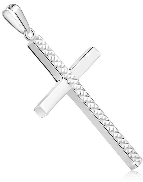 925 ezüst medál nagyobb méretű latin kereszt. A rövid vállak sima és fényes felületűek. A hosszú függőleges vállat átlós bevágások díszítik, amelyek apró négyzeteket alkotnak. A medálon a láncra kerülő láncszem a teteje felé kiszélesedik. A medál méretei:25 x 44 mmA medál súlya: 3,50 gA láncra kerülő láncszem szélessége: 3 mmFémjel - Van. A lánc nem tartoz