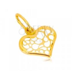 14K sárga arany medál, szabályos szív. Közepén díszes vésetek. Felülete sima és magas fényű. Láncra kerülő szem ovális. Medál mérete: 10 x 8 mmLáncra kerülő szem szélessége: 1,8 mmSúly: 0,2 gFémjelzéssel ellátott. Medál lánc nélkül.