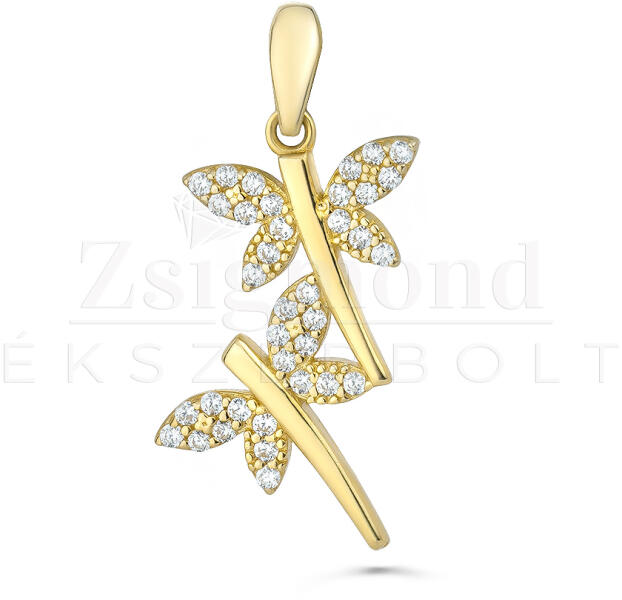A 14K sárga arany medál egy kis lepke körvonalból áll, amelynek fényes és sima a felülete. A lepke szárnyai lekerekítettek és aszimmetrikusak. A láncra kerülő szem a medál felső részében helyezkedik el és beültetett, átlátszó cirkóniákkal van díszítve. Medál méretei (láncra kerülő szemmel): 9 x 10 mmMedál súlya: 0,2 gA láncra kerülő szem szélessége: 2 mmFémj