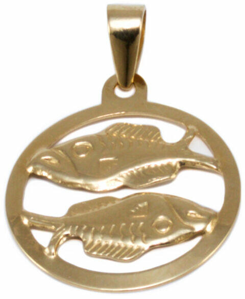 Klasszikus és kedvelt fazonú, halak horoszkópot ábrázoló, kör alakú, áttört kialakítású arany medál.