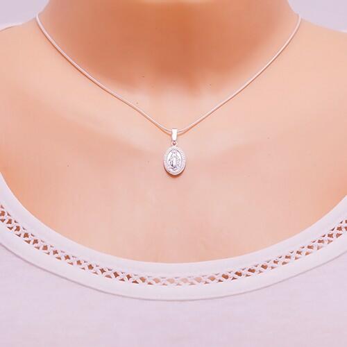 925 ezüst medál kétoldalas és ovális alakú. A csodás érem előlapjának képe a Boldogságos Szűz Mária alakja glóriával, körbevéve fohásszal. A hátlapon nagy M betű motívuma található kereszttel és szívekkel. A láncra kerülő szem hosszúkás és enyhén szélesedő. Medál méretei: 11 x 15 mmMedál súlya: 1,48 gLáncra kerülő szem szélessége: 3 mmFémjelzéssel ell