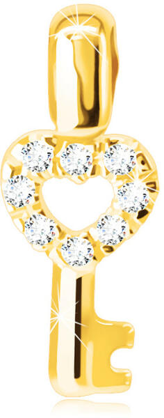 14 karátos arany medál, apró kulcs alakban. A fejecske szív alakban kivágott, mely ragyogó tiszta cirkóniákkal van díszítve. A zár sima és fényes. A láncra kerülő szem szélesebb és fényes felületű. A medál méretei: 6 x 10 mmA medál súlya: 0,5 gA láncra kerülő szem nagysága: 2 mmFémjelzéssel ellátott. Az ár egy medálra vonatkozik, lánc nélkül.