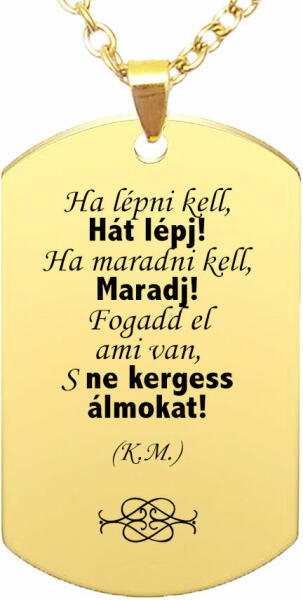 Paraméterek: – Nyaklánc: A szemek kb. 3x4 mm-esek, nem nagyon vastag, nem is vékony. Anyaga rozsdamentes acél. A felirat lapocska kb. 30x6 mm-es, rozsdamentes tüköracél. A lánc hossza és színe választható a listából. Ha nem választasz méretet, alapesetben 50 cm hosszú, és a főképen látható színű láncot küldjük. Tisztítani csak langyos vízzel ajánlott. Vegyszer haszn