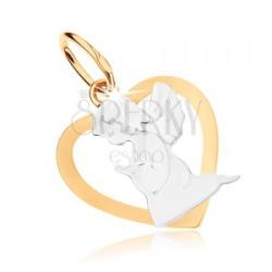 Medál 9K aranyból fényes sárga szívkörvonallal és gravírozott angyalkával fehér aranyból, mely a szív közepébe van elhelyezve. A medál felszíne ródiumozott. A láncra kerülő szem ovális alakú. A medál méretei: 12 x 12 mm A láncra kerülő szem szélessége: 2 mm A medál súlya: 0,2 g Fémjelzéssel ellátott. Medál lánc nélkül. A ródiummal kezelt felület biztosítja