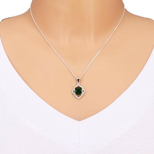 925 ezüst medál smaragdzöld téglalapos cirkóniával, csiszolt felszínnel, melyet átlátszó levélkörvonalak szegélyeznek. A levelek szélei két kisebb, átlátszó csillogó cirkóniákkal kirakott ívvel gazdagodnak. Medál mérete: 15 x 18 mmLáncra kerülő szem szélessége: 3,5 mmSúly: 2,2 gFémjelzéssel ellátott. Medál lánc nélkül. A ródiummal kezelt felület az ékszer ta