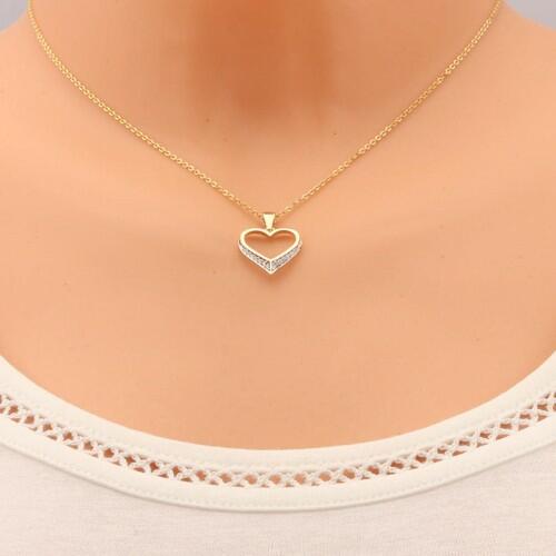 Az 585 arany medált egy szimmetrikus szív körvonala alkotja. Az alsó részben a vonalak enyhén szélesednek, miközben fehér arany réteggel és beültetett, átlátszó cirkóniákkal vannak díszítve. A felső fél sárga aranyból készült, fényes és sima. A láncra kerülő szem hosszúkás alakú és felfelé enyhén szélesedik. Medál méretei: 16 x 16 mmMedál súlya: 1,2 gLáncr