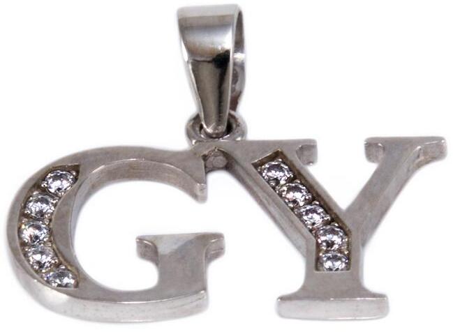 Kedvelt fazonú, cirkónia kősorral ékített, ródiummal bevont "GY" betű arany medál.