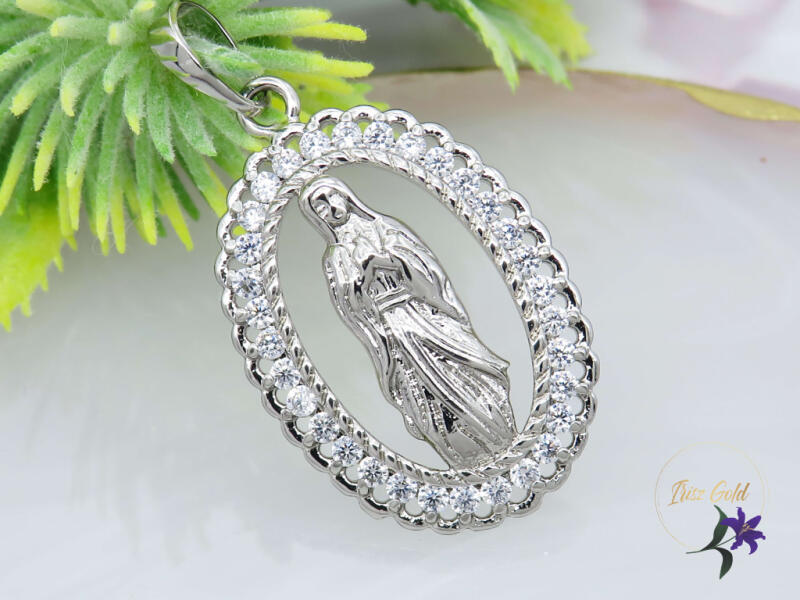 Antiallergén Mária medál cirkóna kövekkel Szin. rodium Méret: 35x20mm A forgalmazott divatékszerek alapanyaga nikkel és ólommentes ezért többnyire nem okoznak allergiás tüneteket, nyugodtan hordhatják fémérzékeny emberek is. Általában nem színezik a bőrt és más divatékszerekhez képest nagyságrendekkel jobb kopásállósággal rendelkeznek. A fehér (ezüst) színű éksze
