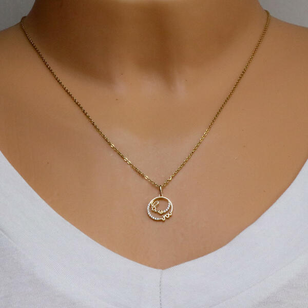 A 14K arany gyémánt medál vékony gyűrű körvonallal. A kisebb, LOVE- „szeretlek felirattal ellátott gyűrű a nagyobb gyűrű belsejébe egy YOU-„téged feliratos gyűrűbe van helyezve. A LOVE YOU- „szeretlek felirat a tiszta briliánsokkal kirakott vonal mellett helyezkedik el. A lánckapocs hosszúkás és a teteje felé kiszélesedik. Medál átmérője: 12 mmA kapocs szélessége