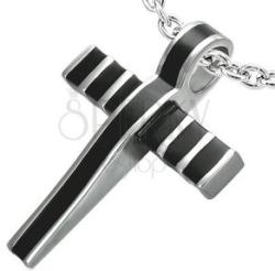 Acél medál - masszív kereszt kidomborodó középpel, amelyet függőleges, fekete sávok díszítenek, vékony, ezüst színű vonalakkal elválasztva. A láncra kerülő szem ovális alakú. Méretek (láncra kerülő szemmel): 34 x 49 mm Láncra kerülő szem szélessége: 4,5 mm Medál lánc nélkül.
