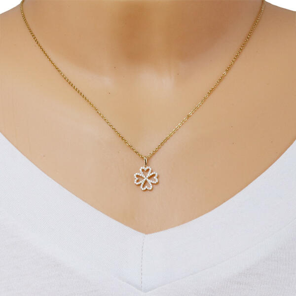 A 9K sárga arany medál négylevelű lóhere alakú, amely szimmetrikus, szív alakú levelekből áll. A körvonal csillogó átlátszó cirkóniákkal van kirakva. A hosszúkás láncra kerülő szem felfelé szélesedik. A medál mérete: 12 x 13 mmA láncra kerülő szem szélessége: 1,5 mmA medál súlya: 0,5 gFémjelzéssel ellátva. Medál lánc nélkül.