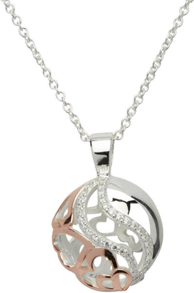 Prémium minőségű ezüst nyaklánc medállal. 18 karátos rozé arany bevonat. Foglalt cirkónia kövek. Bicolor szín. (ezüst/rozé arany) Állítható hosszúságú lánc. Gyári díszcsomagolás. Ékszer anyaga : Sterling ezüst Finomság : 925 ezrelék Medál méret : 15mm x 15mm Lánchossz : 42-45cm Szín : Bicolor Súly : 8,4 gramm Csomagolás : Gyári díszdoboz Garancia : A termékre e