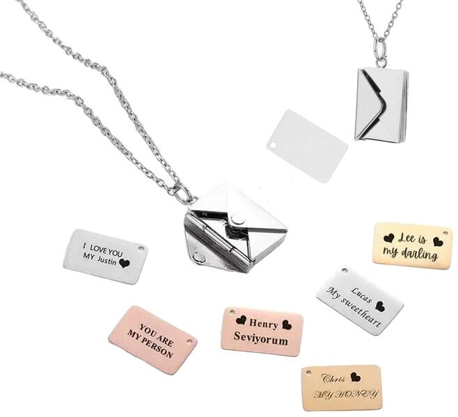Ez a boríték medál nagyszerű módja annak, hogy szívéhez közel álló fontos kifejezést, szót vagy dátumot viseljen. Ez a tárgy szeretetteljes emléket képez, amelyet a címzett örökké megőrizhet. Gravírozott, személyre szabott 3D nyaklánc rozsdamentes acélból 316L. Medál mérete 13,5 x 20,5 mm. Lánc hossza: 45 cm + 5 cm (hossza állítható).