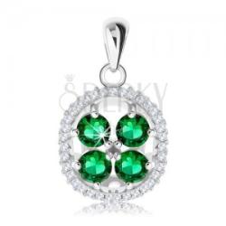 925 ezüst medál, melynek az alapját egy ívelt keret alkotja, tiszta cirkóniákkal a felületén. A keret belsejében négy nagyobb smaragdzöld cirkónia található, hármas karmos fogatban. A medál oldalát dekoratív kivágások díszítik. A hátlap üreges. A láncra kerülő szem alakja hosszúkás és felfele fokozatosan szélesedik. A medál átmérője: 13 mmA láncra kerülő szem