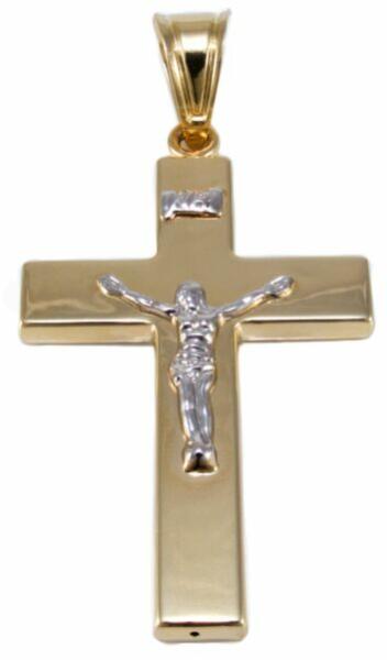 Modern stílusú, ródiummal díszített feszülettel kombinált, üreges, de masszív kialakítású arany kereszt medál.