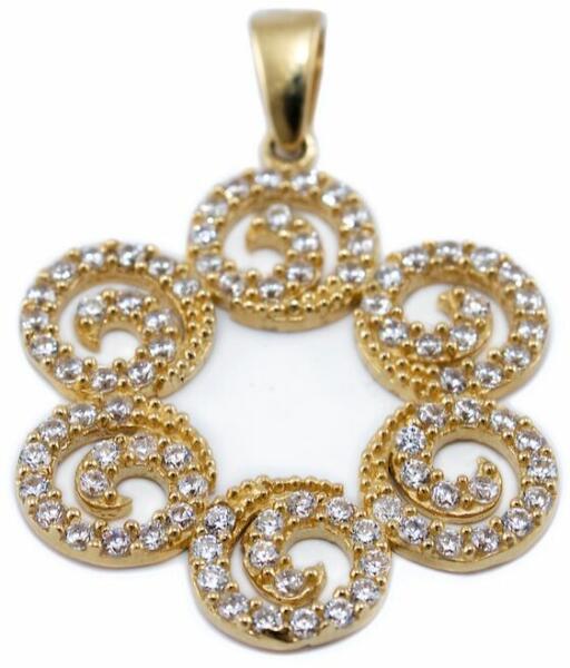 Modern stílusú, kedvelt fazonú, fehér cirkónia kövekkel díszített, áttört, csigás-karikás jellegű arany medál.
