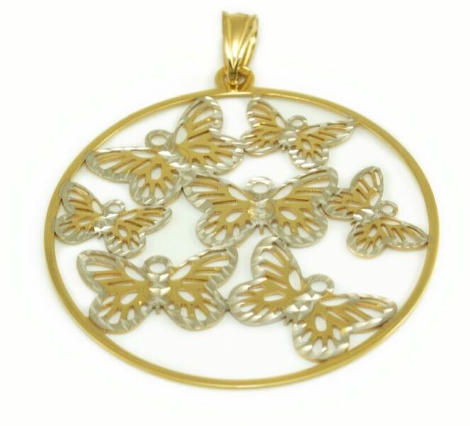 Modern stílusú, könnyű súlya ellenére igen mutatós, ez a véséssel és ródiumozással ékített, áttört, pillangókat ábrázoló, kör alakú arany medál.