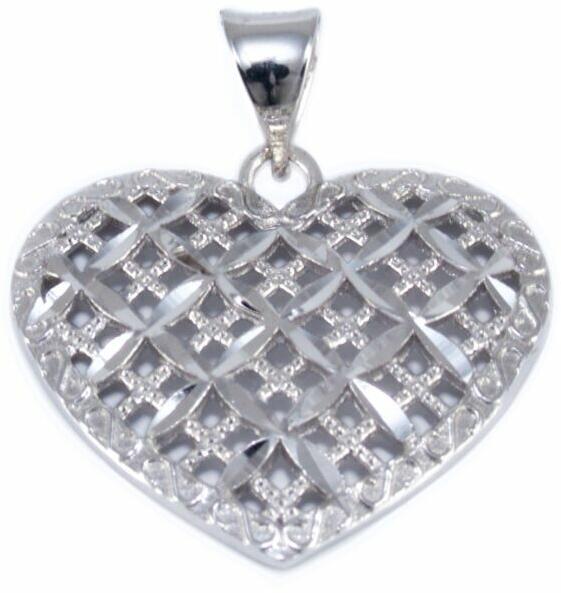 Modern stílusú, kedvelt fazonú, ródiummal és véséssel díszített, áttört, mutatós fehérarany szív medál.