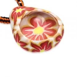 Nyakék zsinórból és medálból. A zsinór három színű fonat, narancssárga, fekete és fehér színű. A medál könnycsepp alakú, egész felülete virág motívummal díszített. Elől egy bemélyedésbe, átlátszó üveggolyó helyezkedik el. A láncra kerülő szem a medál része, zárszerkezete delfinkapcsos. Medál mérete: 23 x 31 mmZsinór szélessége: 3 mmZsinór hossza: 470 mmH