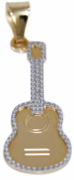 Modern stílusú, kedvelt fazonú, ródiummal és véséssel díszített, lapszerű arany gitár medál.