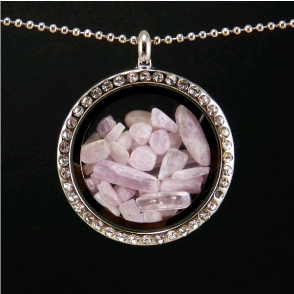 Nagyon sejtelmes, kicsit kaleidoszkópos medálkát készítettem ezekből az aprócska kunzit ásványokból. A két üveglap közt mozgolódó kristályok mindig más mintázatot mutatnak. A medálka nyitható, de a zárat a biztonság kedvéért rögzítettem. A medál és a hozzávaló nyaklánc színe lehet ezüst, vagy arany színű, -ez választható. Az ásványok jótékony hatását még