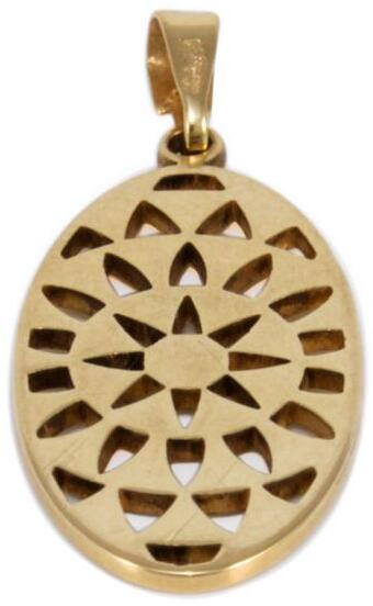 Modern stílusú, kedvelt fazonú, áttört kialakítású, ovális arany medál.