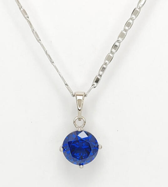 Ezüstszínű alapban foglalt, csillogó királykék cirkónia kristály kerek medál. A kristály karmos foglalatban helyezkedik el. Időtálló ékszer, víz hatására sem feketedik. . Antiallergén ékszer. Medál átmérője: 9 mm. A különböző hosszúságú medálok mintázata esetenként eltérhet a képen láthatótól, szélességük 2 mm vagy 3 mm. Az antiallergén ékszerek olyan fé