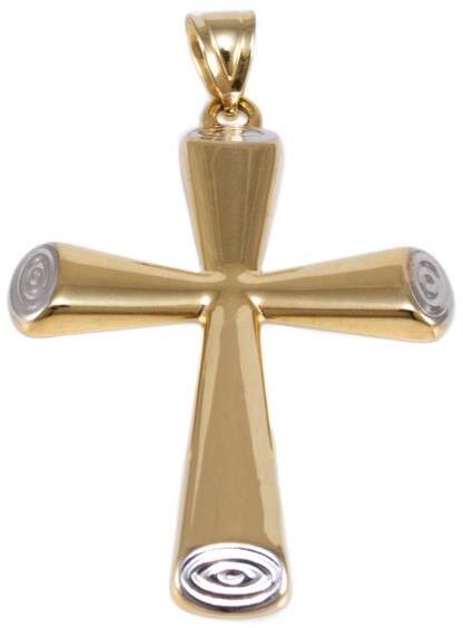 Modern stílusú, üreges, de masszív kialakítású, szélesedő szárú, ródiummal díszített mutatós aranyí kereszt medál.