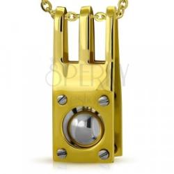 Medál sebészeti acélból - két csatolt lap arany színben, melynek közepén egy ezüst golyócska található. Méretei: 12 x 29 mmA golyócska átmérője: 7 mmA láncra kerülő szem nagysága: 4 mmAz ár egy medálra vonatkozik, lánc nélkül.