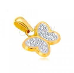 585 kombinált arany medál, szabályos pillangóval díszítve, széttárt szárnyakkal. A szárny rész fehér aranyból készült, csiszolt cirkóniákkal kirakva. A láncra kerülő szem hosszúkás, felfelé enyén szélesedik. Medál mérete: 10 x 7 mmSúly: 0,3 gLáncra kerülő szem szélessége: 2 mmFémjelzéssel ellátott. Medál lánc nélkül.