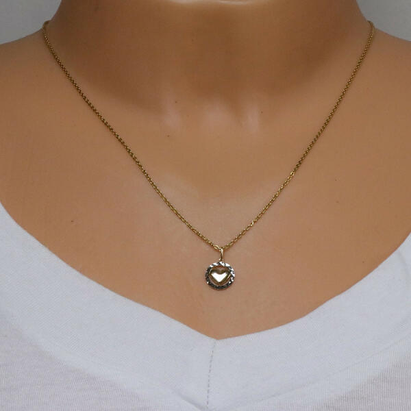 Az 375 kombinált arany medál egy gyűrű körvonalból áll, amelyet csillogó háromszög alakú bemetszések díszítenek. A karika közepébe egy domború tele szív van helyezve. A hosszúkás láncra kerülő szem felfelé szélesedik. A medál átmérője: 10 mmA láncra kerülő szem szélessége: 1,5 mmA medál súlya: 0,32 gFémjelzéssel ellátva. Medál lánc nélkül.