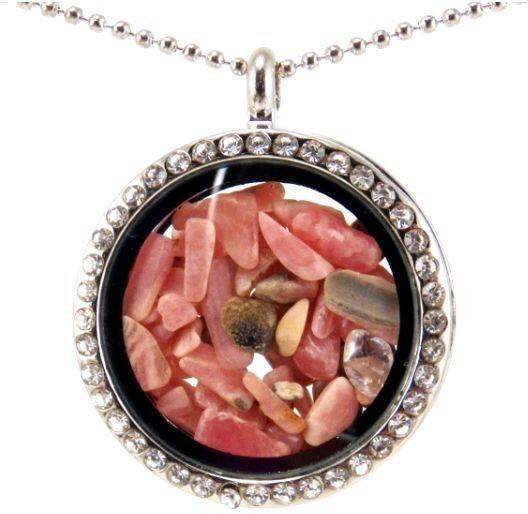 Nagyon sejtelmes, kicsit kaleidoszkópos medálkát készítettem ezekből az aprócska rodokrozit ásványokból. A két üveglap közt mozgolódó kristályok mindig más mintázatot mutatnak. A medálka nyitható, de a zárat a biztonság kedvéért rögzítettem. A medál egyik oldala körbe csillogó kristályokkal van díszítve, a másik fele sima. A medál és a hozzávaló nyaklánc szín