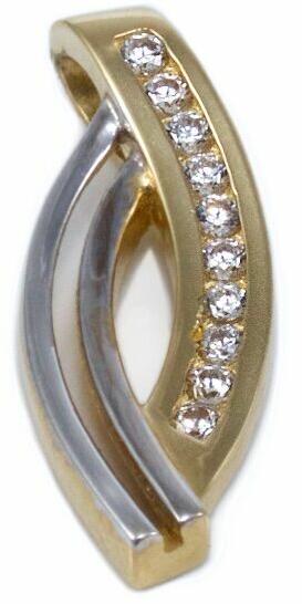 Modern stílusú, sávosan áttört, ródiummal és cirkónia kövekkel ékített hosszúkás arany medál.