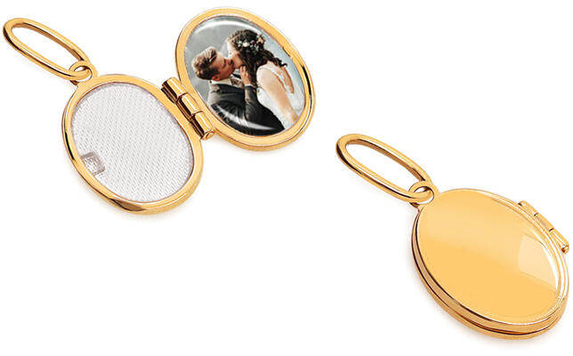 Ovális alakú medál sárga aranyból. A középen nyíló ajtóval 2 fotót tehetsz a tokba. Az ékszer mindkét oldalról személyre szabható.