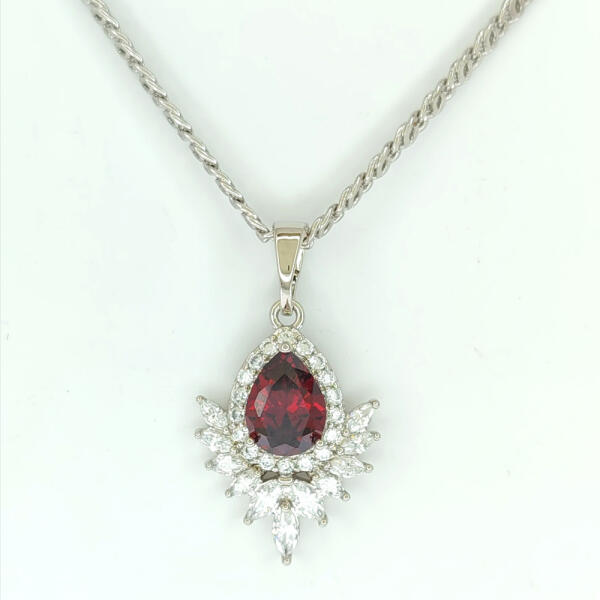 Ezüstszínű, csillogó bordó és fehér cirkónia kristállyal díszített medál. A kristályok karmos foglalatban helyezkednek el. Időtálló ékszer, víz hatására sem feketedik. Antiallergén ékszer. Medál mérete: 14 mm x 18 mm. A különböző hosszúságú medálok mintázata esetenként eltérhet a képen láthatótól, szélességük 2 mm vagy 3 mm. Az antiallergén ékszerek olya