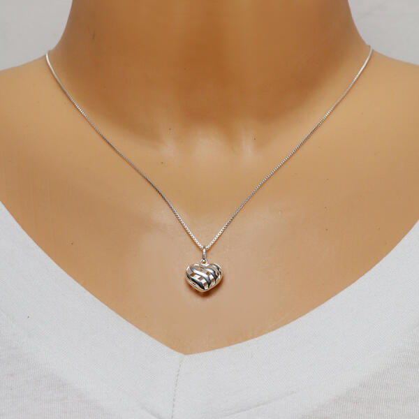 A 925 ezüst domború szív alakú medál átlós kivágásokkal és finom hullámos formájú sávokból áll. A sávok felülete sima és fényes. A medálon a láncra kerülő láncszem ovális alakú. Medál mérete: 14 x 13 mm A láncra kerülő láncszem szélessége: 2,5 mm A medál súlya: 1,49 g Fémjel - Van. A lánc nem tartozék.