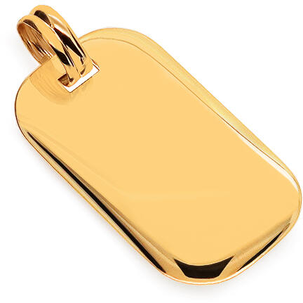 Sárga, tizennégy karátos aranyból készült medál. A lemez téglalap alakú, lekerekített peremekkel, magasfényű felülettel. A lemez szélessége 20 mm, a láncon található szem átmérője 6 mm, a medál magassága a szemmel együtt 35 mm. Alkalmas kezdőbetűk, nevek, dátumok begravírozására, a gravírozás csak nálunk ingyenes.
