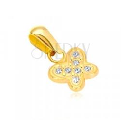 14K sárga arany medál, lepke alakzat. Középen hét kerek, átlátszó cirkónia található. A medál felülete sima, fényes. A láncra kerülő szem hosszúkás, felfelé enyhén szélesedik. Medál méretei: 6 x 5 mmMedál súlya: 0,1 gLáncra kerülő szem szélessége: 2,5 mmFémjelzéssel ellátott. Medál lánc nélkül.