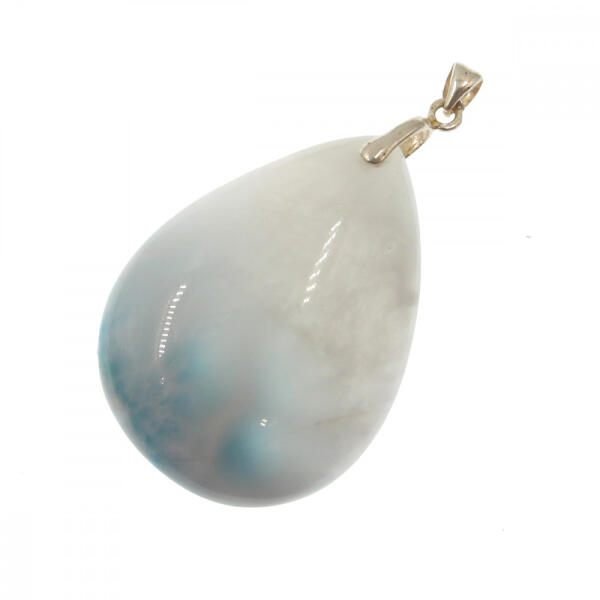 Nagyon ritka, természetes Larimar (Larimár, kék pektolit, vagy delfinkő néven is ismert) ásványból készült, csepp alakú medál. Gyönyörű ég-kék színű, felhőszerű rajzolatú, enyhén átetsző cabochon drágakő. Bővebb információ "ADATOK PARAMÉTEREK" fül alatt. A Larimar vélt hatása