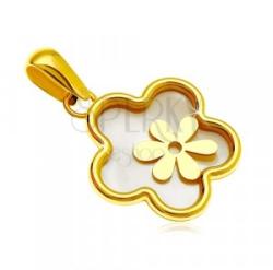 A 14K sárga arany medál virág alakú, fényes arany széllel, amelynek közepét fehér, természetes gyöngyház tölti ki, enyhén szivárványos visszfénnyel. Az alsó részben egy apró arany virág helyezkedik el. A láncra kerülő szem hosszúkás, felfelé enyhén szélesedik. Medál méretei: 12 x 12 mmMedál súlya: 0,4 gLáncra kerülő szem szélessége: 2 mmFémjelzéssel ellátot