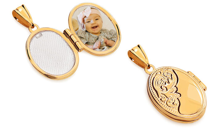 Eredeti arany medál, nyitható medailon formájában, amelybe fénykép illeszthető. A medailon ovális alakú, az elülső oldalán ornamentális mintával díszítve.